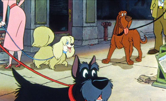 Which brings us full circle back to Oliver and Company, as Pongo (or perhaps one of his now full-grown pups) appears in that same song, straining to escape his lead.